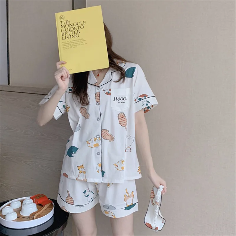 Caiyier, летние женские хлопковые пижамы, наборы, милый белый кот